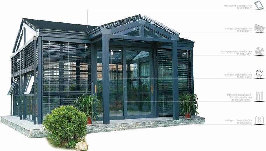 上海郝荣智能建筑有限公司V9阳光房采用高强度铝合金为原材料,经酸洗铬化、电泳或静电喷涂,木纹转印处理后,经过精密设计造型,配合Low-E玻璃封闭,别具一格。隔热保温,防止紫外线,美观大方,可打造休闲或办公空间,简洁、上乘、实用,为建筑提升整体档次。